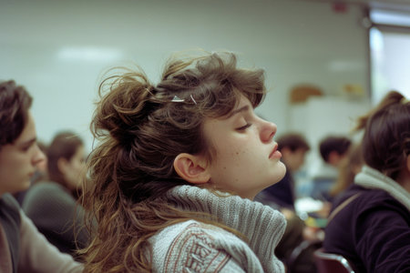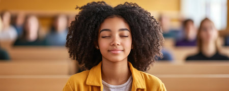 A young woman sits in a classroom, her eyes closed in contemplation. She is surrounded by other students, but she appears to be lost in her own thoughts.