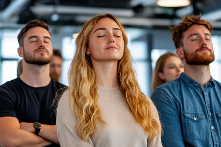 A multicultural team sits peacefully in a serene environment, their eyes gently closed as they embrace tranquility and inner focus during a shared mindfulness session.