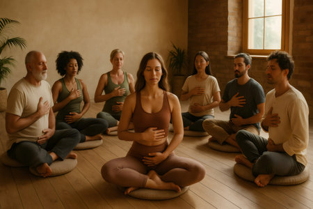 Group meditation session in a yoga studio focusing on breathwork and mindfulness practices