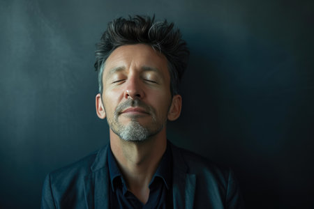 Adult with patient acceptance gentle exhale overcast window key and clay wall calm portrait for wellness counseling education and mindful communication