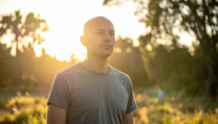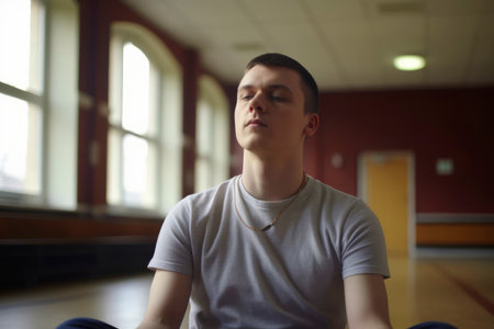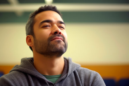 Soft sunlight bathes a man in a serene indoor space, as he embraces a moment of deep relaxation and reflection.