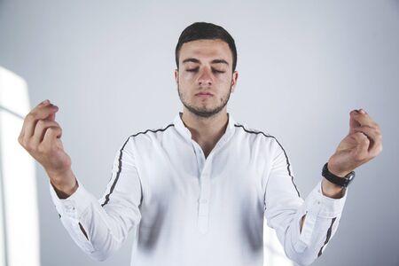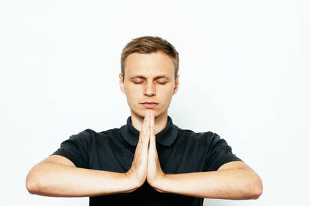 Man praying. Concentrated young man in white shirt holding hands clasped near face while standing against grey background