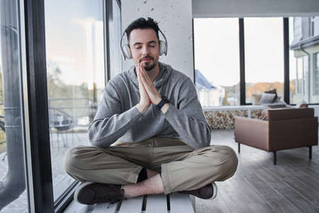 Man wearing headphones sitting with closed eyes at the lotus pose at the windowsill