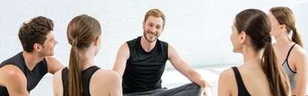 panoramic shot of five young people smiling at talking while sitting in sports center
