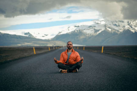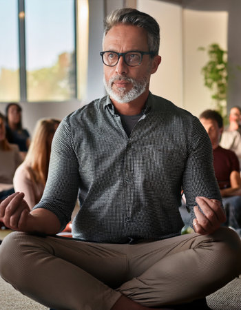 Stock photo of caucasian man sitting crossed legged meditating. He has his eyes closed.
