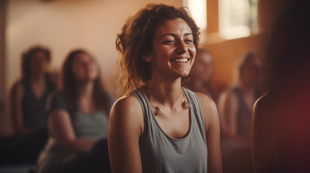 Attractive hispanic woman talking about a yoga routine with a group of people after finishing a class together