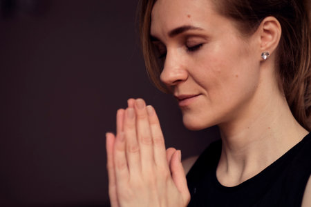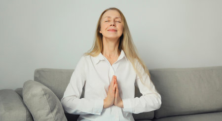 middle aged woman meditating with her eyes closed, practicing Yoga with hands in prayer position.