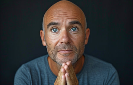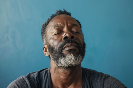 a Middle-aged African American Man Engaged in Spiritual Meditation: A middle-aged African American man sitting in meditation, with a focused expression on his face as he connects with his inner self. The studio background is a serene blue, representing introspection and calm