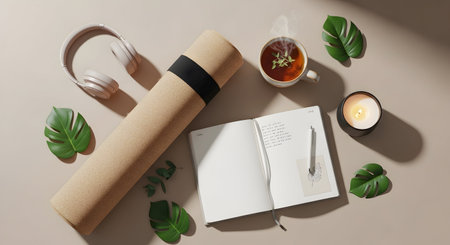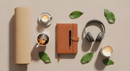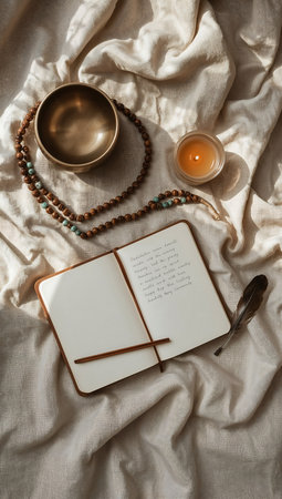 Meditation accessories and yoga props arranged for mindfulness, sound healing, and wellness rituals at home