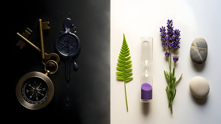 Flat lay composition with lavender, compass and keys on black and white background