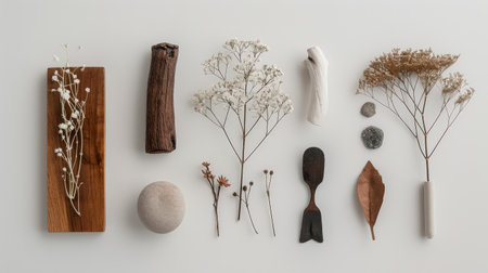 A visually appealing flatlay of essential craft tools alongside natural elements, presented on a neutral background for design inspiration and creativity.