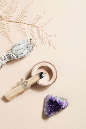 Palo Santo sticks, dried sage and druse amethyst, magic rock for ritual, witchcraft, spiritual practice, meditation. esoteric life balance concept.