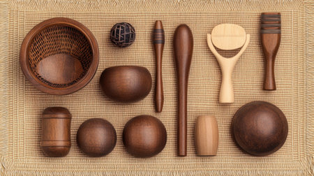 A top view of an assortment of wooden kitchen utensils and craft tools displayed on a natural material backdrop, showcasing the beauty of artisan craftsmanship.