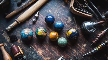 A collection of vibrant, handcrafted decorative orbs set against a rustic wooden table filled with various crafting tools, showcasing artistry and creativity.