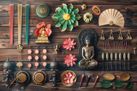 Buddha's Birthday Celebration with Lotus Flowers, Incense, and Lanterns on Wooden Background AI