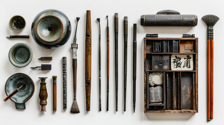 A neatly organized flat lay of Chinese calligraphy supplies featuring brushes, ink blocks, and ceramic bowls on a crisp white background. This set symbolizes the purity and discipline of the calligraphy art form and its revered place in cultural heritage.