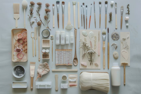 Art supplies arranged in a creative flat lay, inspiring artistic endeavors and DIY projects.