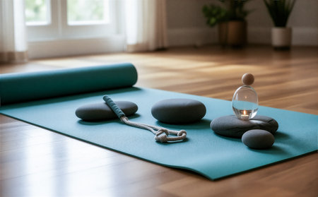 Yoga mat with stones and candle on wooden floor in the living room