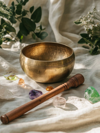 Brass singing bowl placed on soft fabric surrounded by colorful crystals