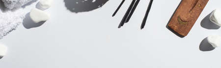 top view of black incense cones, stones, aroma sticks and decorative ball on white background, panoramic shot