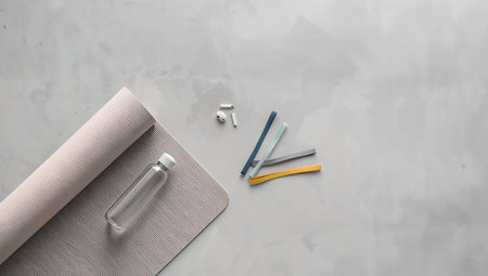 Yoga mat and accessories on the ground. Fitness and healthy lifestyle concept.