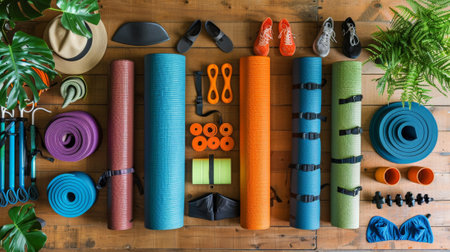 fitness equipment, an array of vibrant yoga mats and fitness accessories sprawled on a wooden floor, inspiring a healthy and active lifestyle