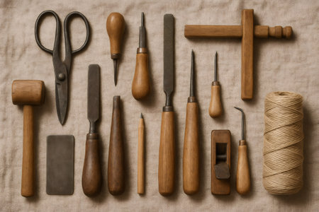 Various woodworking and crafting tools are meticulously organized on a linen canvas, highlighting the importance of precision and craftsmanship