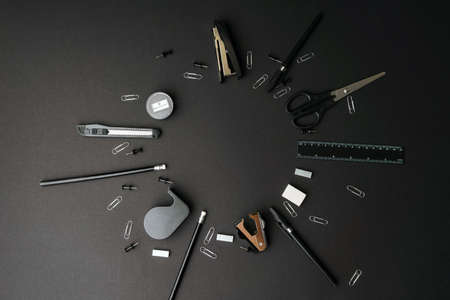 Stationery is laid out on a dark background. In the center is an empty place in the form of a circle.