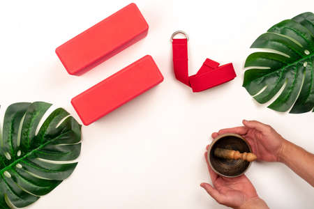 Accessories for yoga and pilates on a white background: support bricks and a belt for proper stretching, a mat. Male hands hold a singing bowl against the background of yoga items