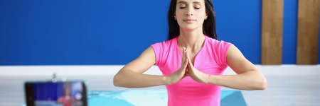 Calm fit young woman closing eyes and holding hands in namaste gesturewhen meditating after yoga practice
