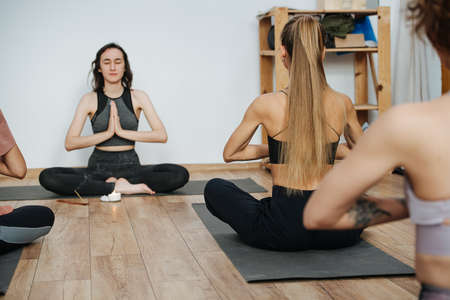 Group, people and meditation for yoga in class with zen, spiritual awareness and holistic healing. Women, namaste pose and inner peace with mindfulness practice, balance and session for mental health