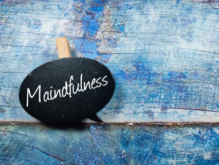 Text Maindfulness writing on wooden board on a blue wooden background. Trending photos concept.