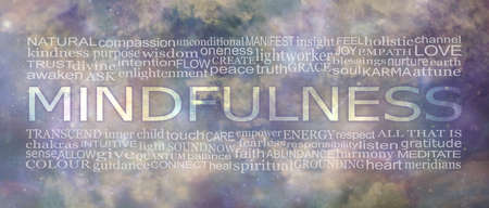 Mindfulness Word Cloud Art Banner - beautiful celestial cloudscape background with a word cloud divided above and below the word MINDFULNESS creating an attractive art panel