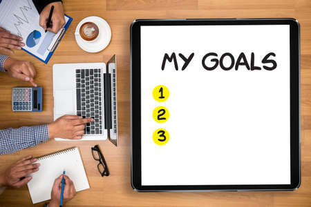 MY GOALS Handwriting of My Goals Business team hands at work with financial reports and a laptop
