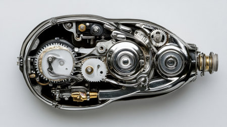 An artistic closeup of a mechanical engine system showcasing intricate gears and cogs in polished silver finish, highlighting the beauty of engineering design.