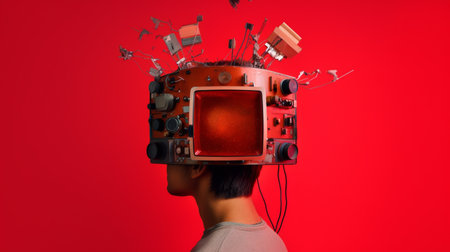 Man in a suit with an intricate TV set as a head, wires exposed. Hyper-Realistic Cyborg with Television Head