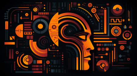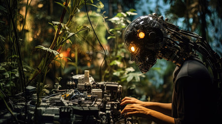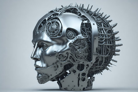 A stunningly portrayal merges a human head with an AI machine, showing intricate cybernetic details.