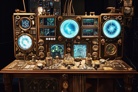 A table filled with a diverse assortment of clocks, displaying different sizes, shapes, and designs, An intricate time machine console with numerous levers, buttons, and glowing screens, AI Generated