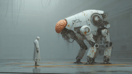 A mesmerizing sci-fi scene featuring a giant robot with a brain-like head in an eerie environment, highlighting themes of technology and human interaction.