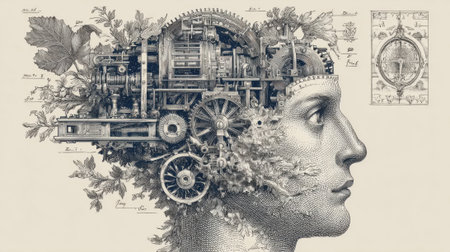 A detailed illustration elements depicts a human profile filled with mechanical gears and floral, combining nature with technology through artistic sketches in the background.
