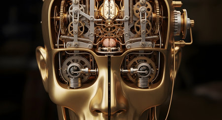 A conceptual image showing a cutaway of a human-like head, revealing intricate clockwork gears and cogs instead of a brain. This surreal illustration represents concepts like artificial intelligence, psychology, mechanics of the mind, and complex thought processes.