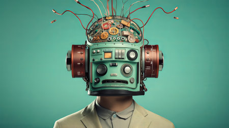 This captivating image showcases a surreal depiction of a human skull, intricately designed with steampunk elements, including gears and clockwork mechanisms, symbolizing the interplay between creativity and technology.