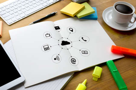 An open notebook featuring a mind map, surrounded by sticky notes, coffee cups, and office items that inspire creativity and organization in a productive workspace.