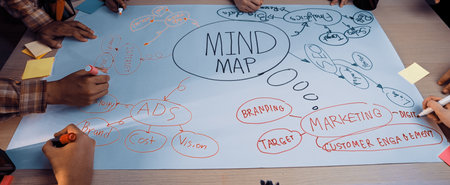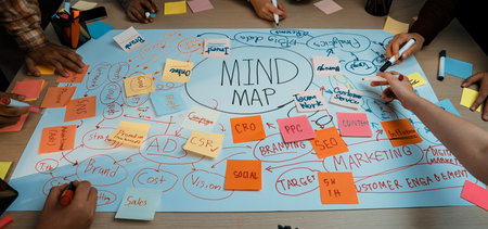 A vibrant scene of a collaborative mind mapping session showcasing diverse hands engaged in brainstorming marketing strategies using colorful notes and diagrams.