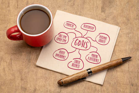 setting goals in different life areas, mind map sketch on a napkin with a cup of coffee, business and personal development