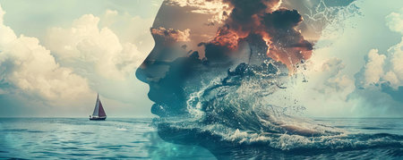 A visual representation of mindfulness a head filled with calm ocean waves and a sailboat navigating gently