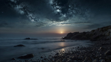 Moonlight in ocean landscape. The ocean stretches out as far as the eye can see, its surface a canvas of deep, midnight blue. AI generated image