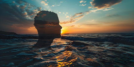 Beautiful double exposure of a human silhouette with ocean landscape and sunset. This artistic image represents tranquility, mindfulness, and nature