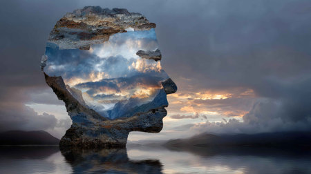 A striking silhouette of a human face blends seamlessly with a serene landscape, showcasing a beautiful harmony between nature and individual spirit.