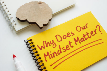 A bright workspace features a neat notebook with the words success mindset prominently written. Nearby, a pen and glasses rest, creating a calm and focused atmosphere for planning.